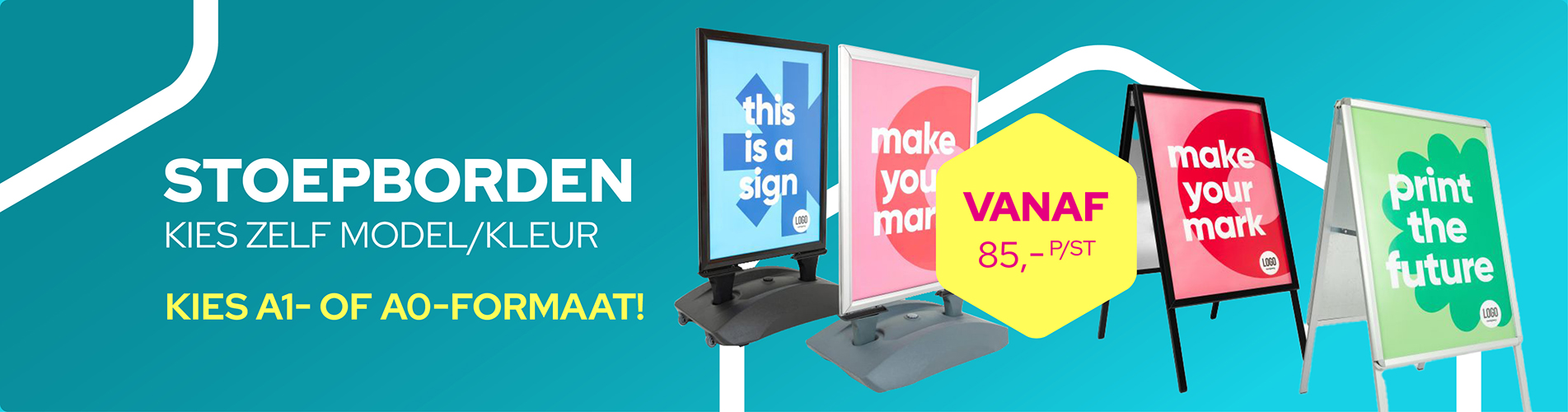 Denk aan binnenreclame zoals bijvoorbeeld een behangcirkel, een voordelige rolbanner en een vloersticker op maat. Ook flyers en folders kunt u gemakkelijk online bestellen en laten printen vanaf lage oplage. Buitenreclame zoals bijvoorbeeld een bedrukte mastvlag of bedrukte beachflag, een banier laten bedrukken, een dranghekdoek en een spandoek op maat. Aankleding van een festival, beurs of evenement? Kortom, alles om uw bedrijf, merk, dienst en/of product te promoten.